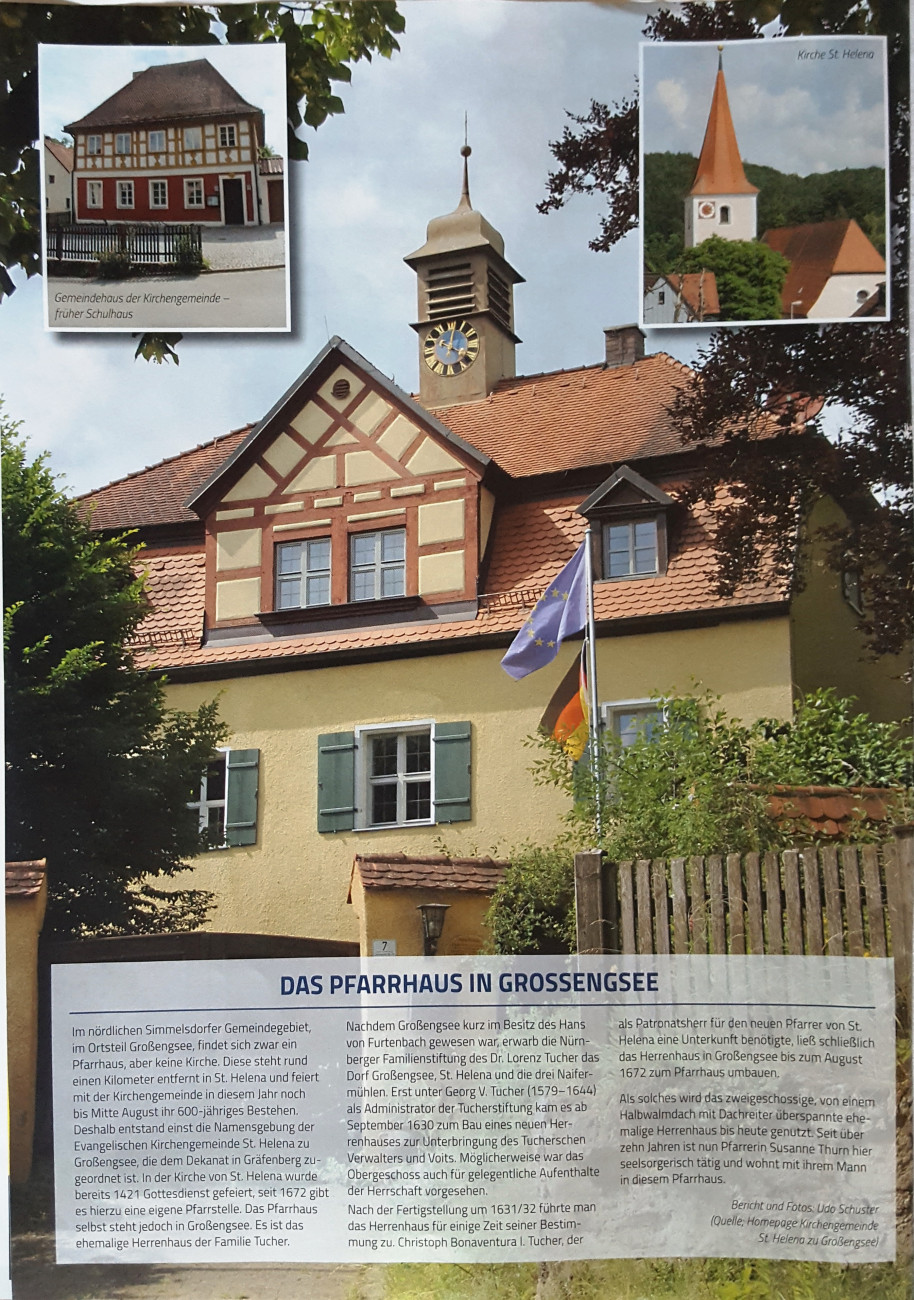Unser Pfarrhaus wurde im 16. Jahrhundert als Nürnbergisches Herren- und Vogthaus erbaut. Ab 1574 war es im Besitz der Nürnberger Patrizierfamilie Tucher von Simmelsdorf. Schon 1672 wurde es als Pfarrhaus der Evangelisch-Lutherischen Kirchengemeinde St. Helena zu Großengsee überlassen.